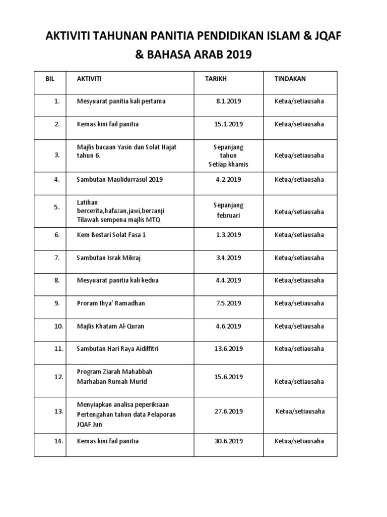 Aktiviti Tahun Panitia Pendidikan Islam 2019 Pdf